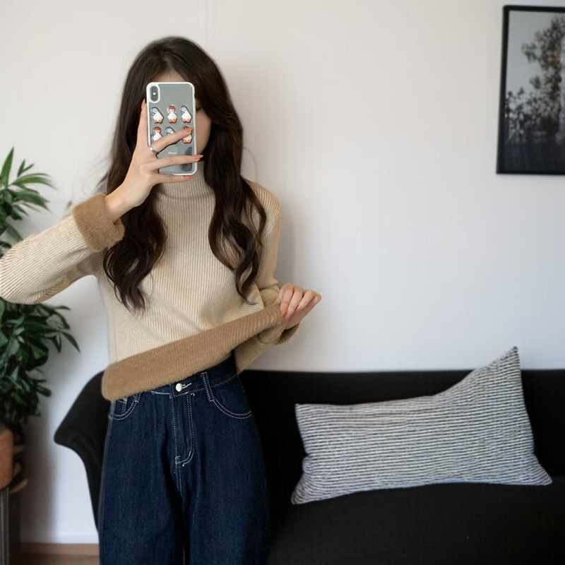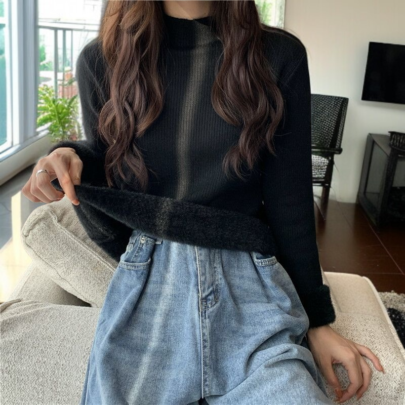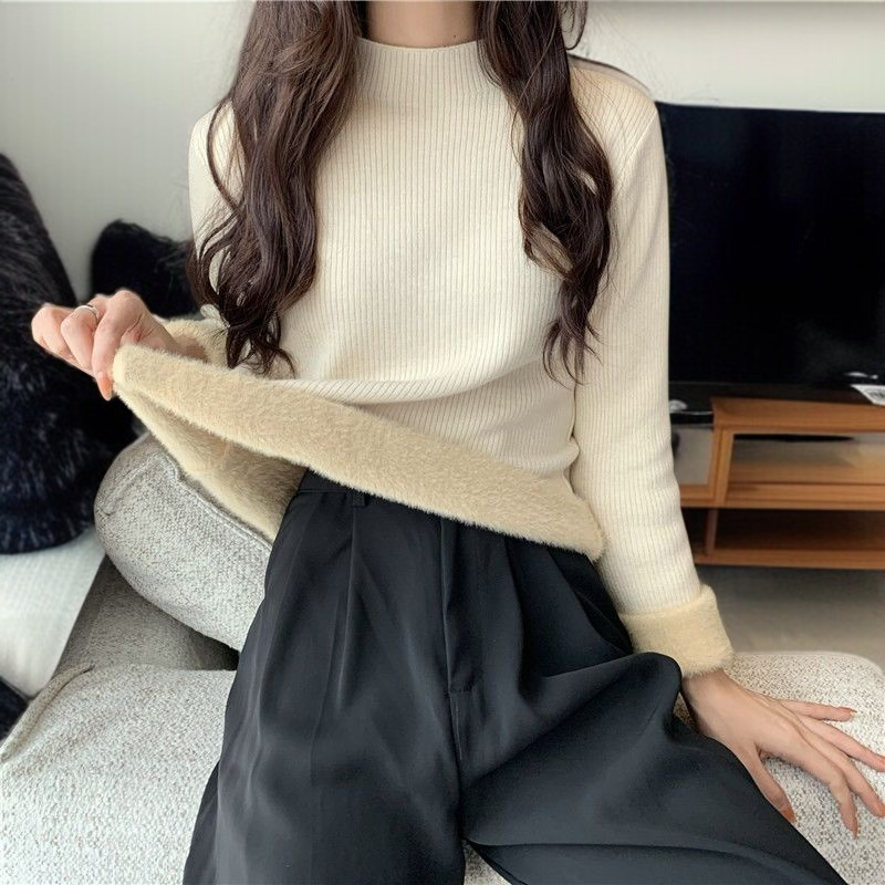中わた入り厚手ニットレディース長袖ワンピースフリーストップス秋冬ボトムスシャツハーフハイネックニットソー